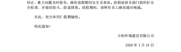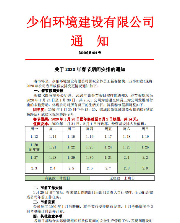 公司2020年春节假期安排公告